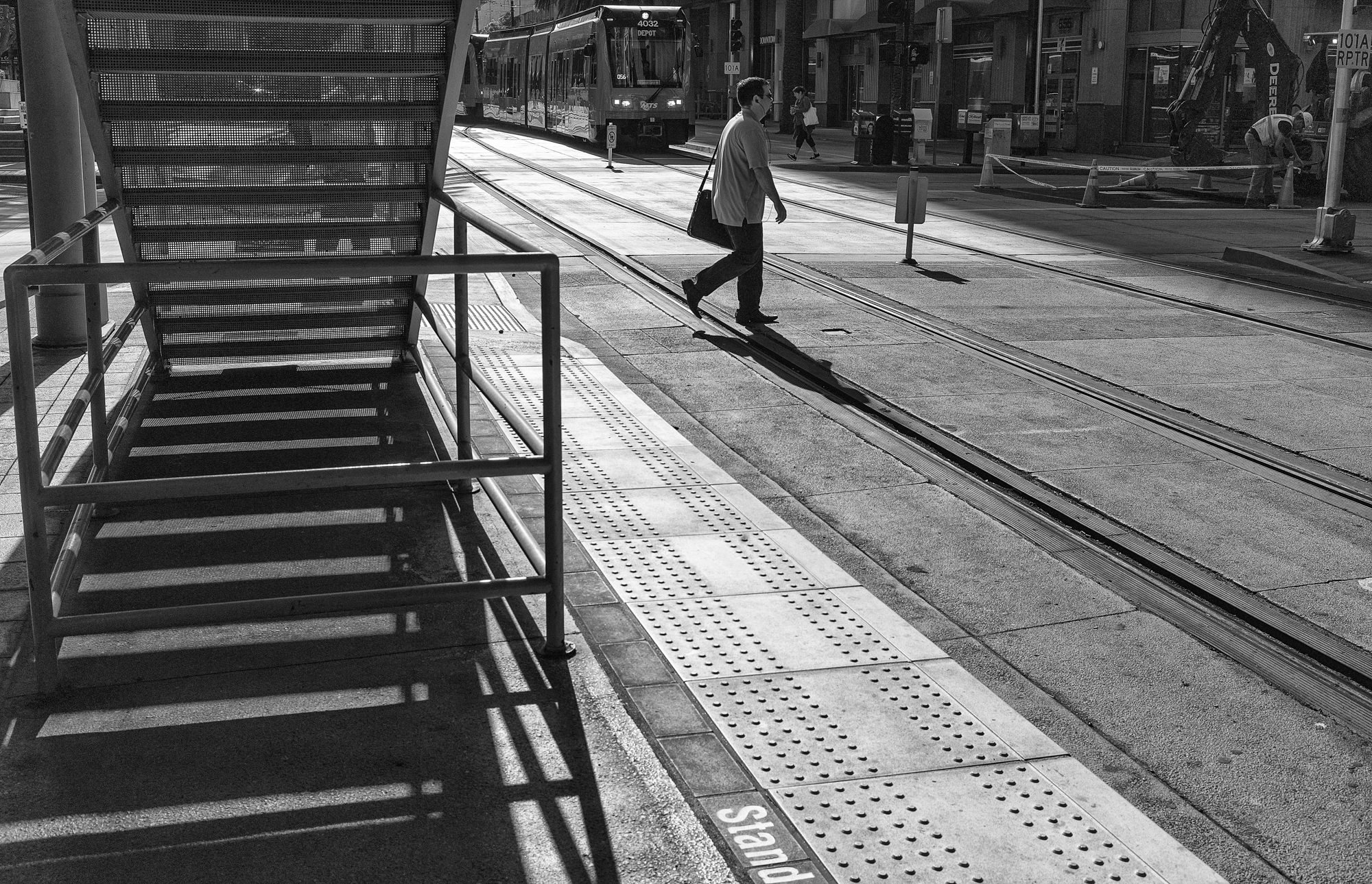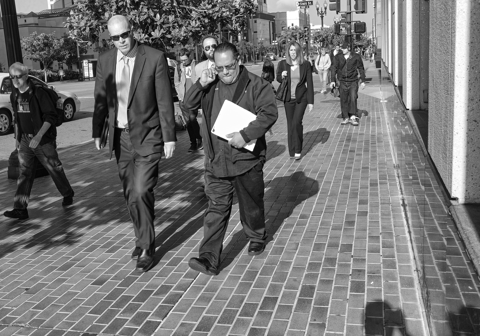 On a very brief stroll while in San Diego on business, we were reminded of just how powerful that SoCal light is in the A.M., people walking on a flat surface yet seeming to have to push against it to get anywhere. Good things happen where light meets dark, photographers say, and we were reminded just how much of those contrasting elements West Coast photographers have to play with. We materialize in shadow in the lower right. Leica Monochrom, 35mm Summilux FLE, orange filter.