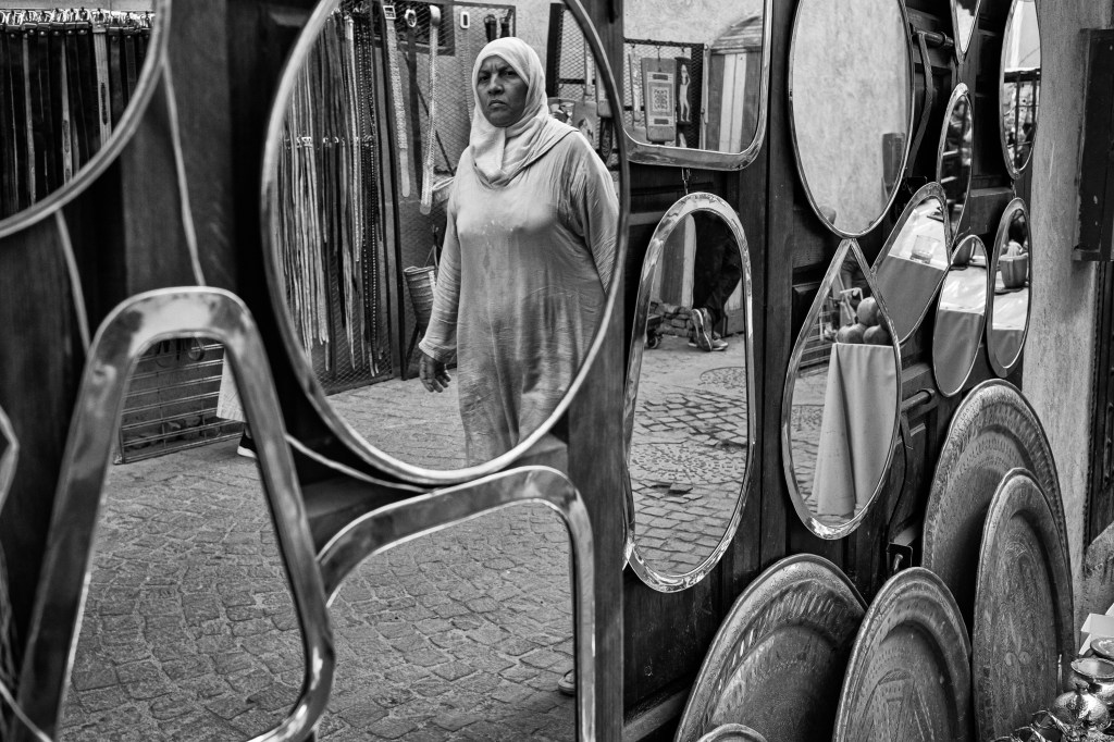 Out in the street, though, it was a different matter. I walked casually with the camera at stomach level, ISO high enough to support an f/5.6 – 8 exposure, focus set to the hyperfocal distance of approximately 25 feet, and took pictures of people in the Medina’s full cacophony of sounds and riot of smells, the motorcycles pushing through, the donkey carts trying to get by. It was, as they say, a target-rich environment. Over several days wandering through the Medina, only occasionally did I raise the camera to my eye, and only a few times was I called out for taking a picture.