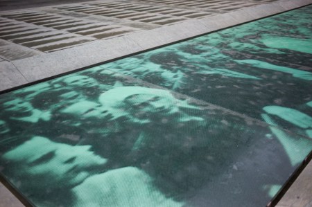 And in the Bebelplatz, where the books were burned, even in the shadow of one of the world’s great universities, there now is a thick pain of glass that allows light to emanate from an emptied library below. Look carefully. Click on the photograph to see the ghostly details.
