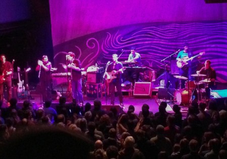 They returned to D.C. with a harder edge than when they last showed up, in 2008, promoting the magnificent Carried To Dust. Where that album conjured Monument Valley spires, Anasazi mysteries, and a Mexican folkloric tradition, Algiers is a purer expression of pop craft, even as it’s purpose-built on top of south-of-the-border idioms. Listen to “Sinner By The Sea,” which they returned with for the first encore, to see what we mean: it starts like something you’d hear late at night in a Vera Cruz dancehall, but keeps a slow, garage-rock beat before efflorescing into a Chris-Isaaks-meets-the-Fleshtones bit of rock’n’roll magic. Last time ’round, Joey Burns played the lion’s share of guitar, with a pedal steel player and bassist the other stringed instrument supporters. This time around, the core of Burns and Convertino returned with the multitalented Mexicali horns, but also a smokin’ young guitarist who seemed as adept on lap pedal as lead. Convertino is the most confident drummer who ever led a band from so small a geographic section of his drum kit. And the dexterity of the musicians switching between horns and accordions and keyboards was like watching an All Star team shift the infield.