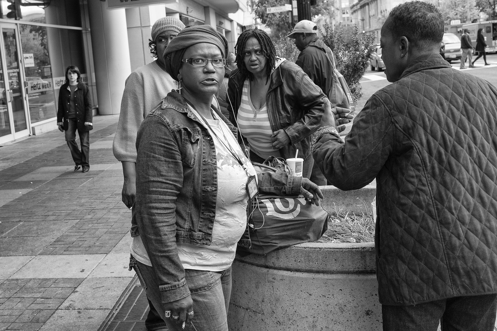 Yesterday, as part of the FotoWeek DC festival, we had a portfolio review with the wonderful D.C.-based photographer Frank Van Riper.  Frank publishes photo books, runs photo workshops, and employs skills developed during his first career as a New York Daily News reporter to write about photography.  One of his favorite photographers is the late Gary Winogrand, whose massive retrospective will be installed at The National Gallery of Art next March.  In reading some of what Frank has written about Winogrand in the Washington Post,  we were reminded that Winogrand’s technique for disarming people on the street who might not at first understand why someone was taking their picture was always to smile and be friendly.  We tend not to have much problem doing so, which is how the photo above, taken on Friday, ended up with us having a nice conversation with the women who, in this frame, admittedly do not seem particularly happy…