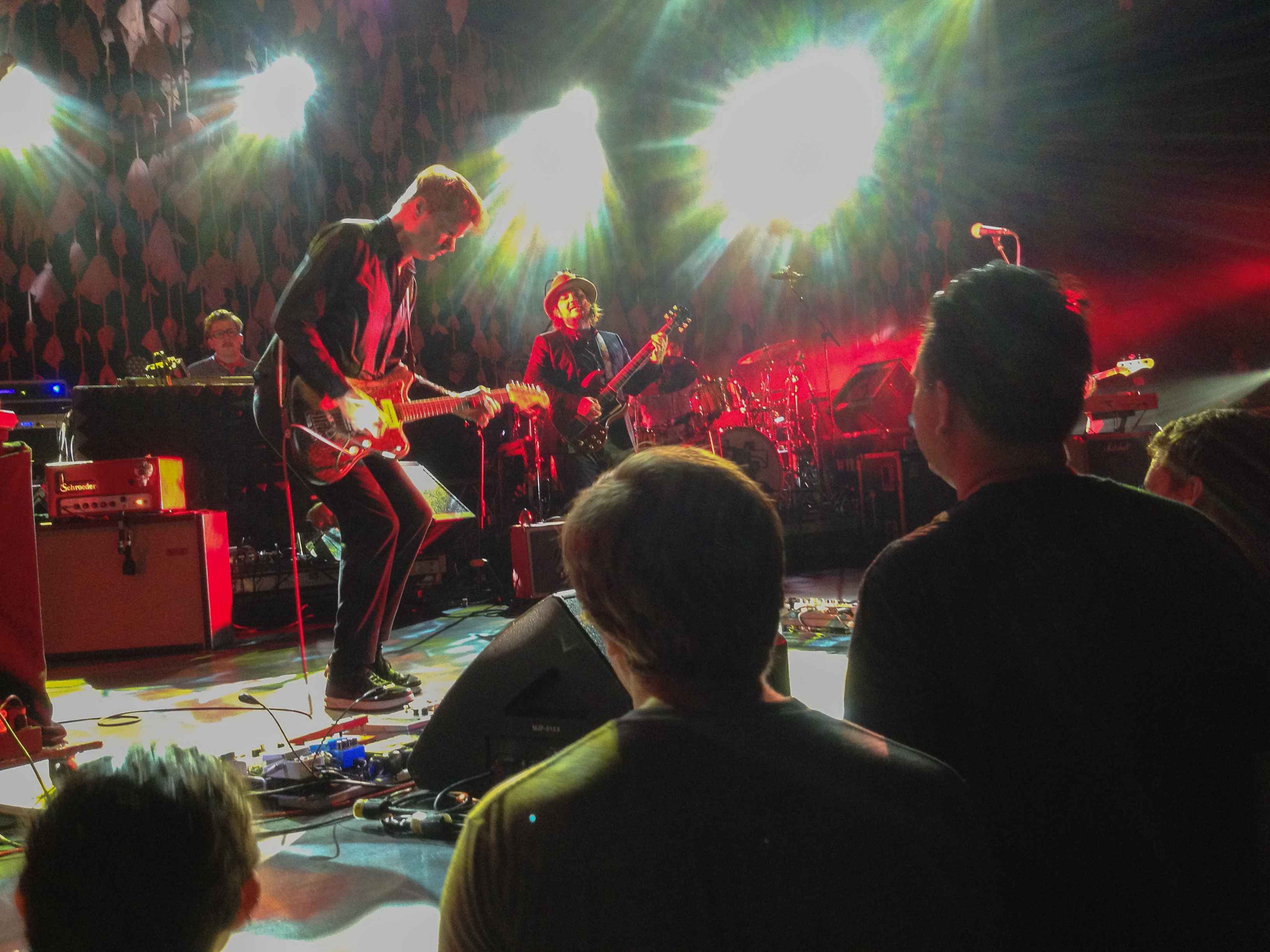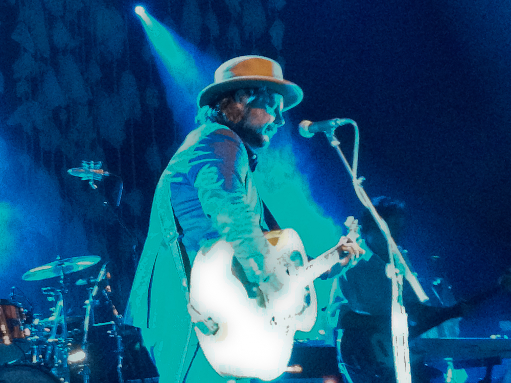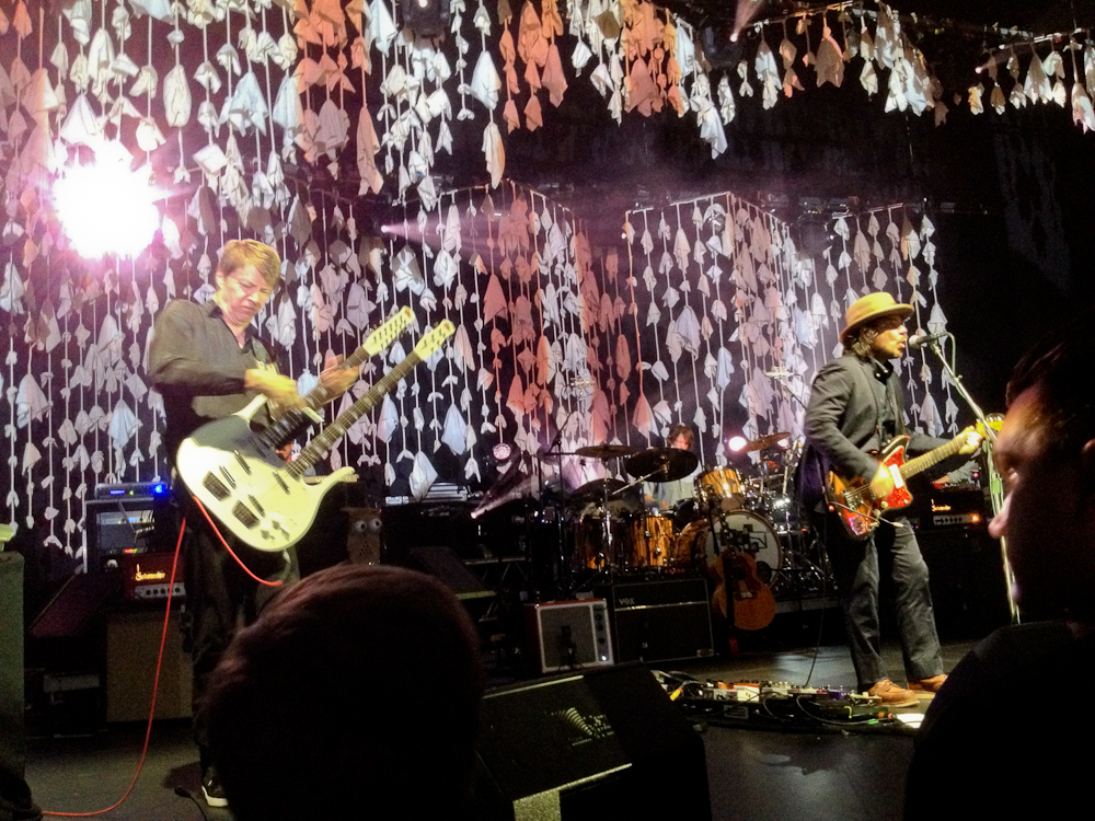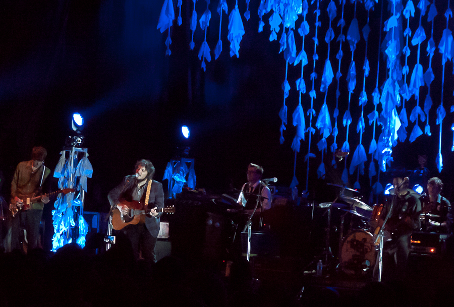 The first three songs of the concert the other night, all from The Whole Love — “The Art of Almost,” followed by “I Might,” followed by “Black Moon” — could be Wilco in miniature: experimental art-rock building to a psychedelic crescendo, followed by an homage to the New Wave soul sound of Get Happy, followed by a tuneful acoustic picker of almost breathtaking delicacy. Sometimes the live band consists of three guitars and a keyboard, or two keyboards and two guitars, but its sound is always dense and layered, with multiple virtuosi — talents on the order of Nels Cline and Pat Sansone aren’t usually teamed in the same band, just like baseball teams don’t usually have a rotation like the Phillies’ — and always there is Tweedy, the Everyman with the rumpled, just-out-of-bed-even-if-I’m-dressed-up look, and the voice that is astonishingly even, steady, youthful, deceptively elastic and true. We used to think it was anodyne, now we think it’s genius.